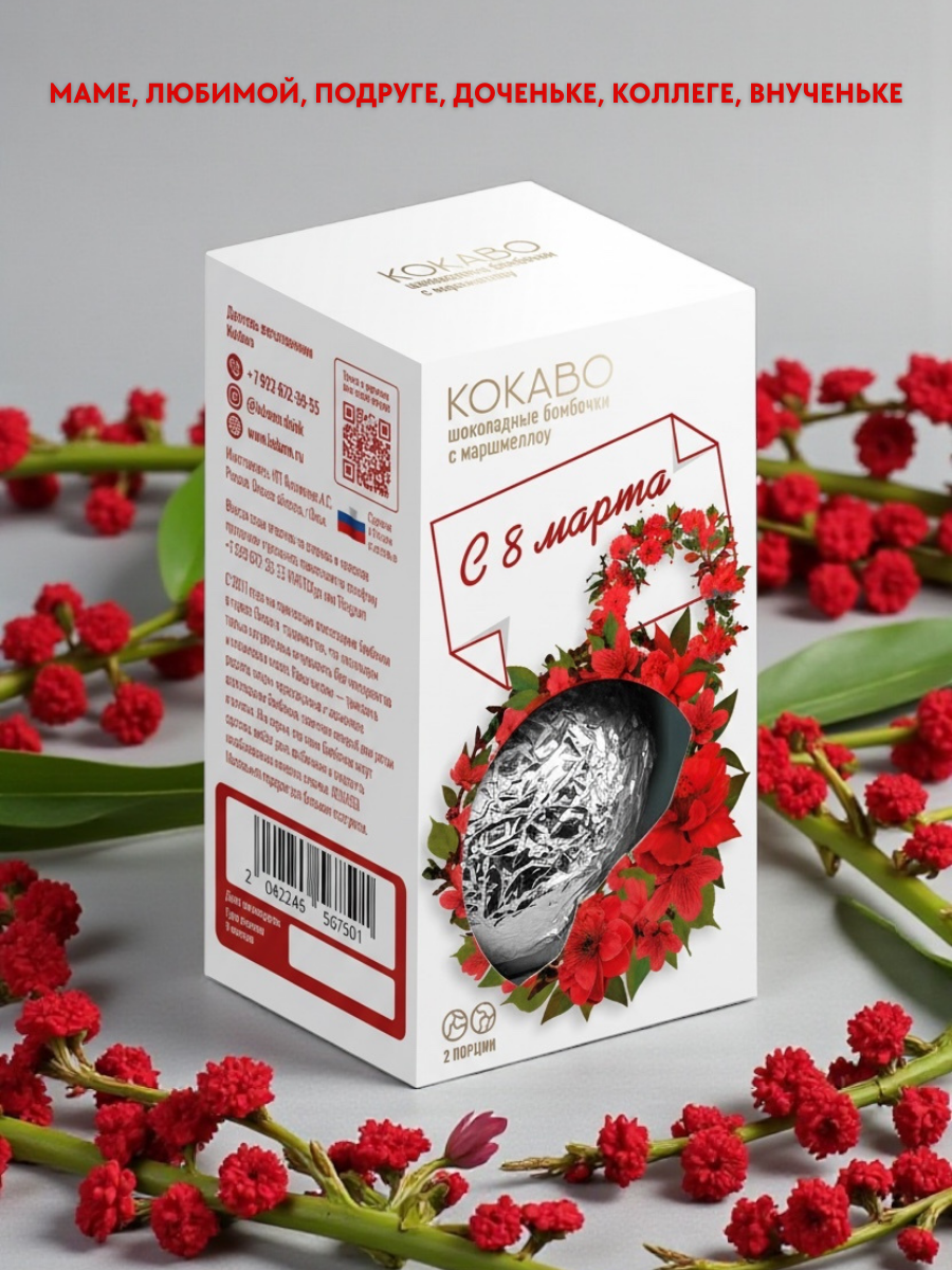 Забудьте про обыденность, подарите себе и своим любимым момент истинного наслаждения вместе с нашими восхитительными шоколадными бомбежками для приготовления какао  ко дню 8 Марта! Подарочная упаковка сделает этот день еще ярче и теплее, а входящие в состав маршмеллоу добавят нотку воздушной сладости каждому глотку. Прекрасный выбор как для себя, так и для любимых женщин – почувствуйте радость от каждого мгновения этого весеннего праздника!